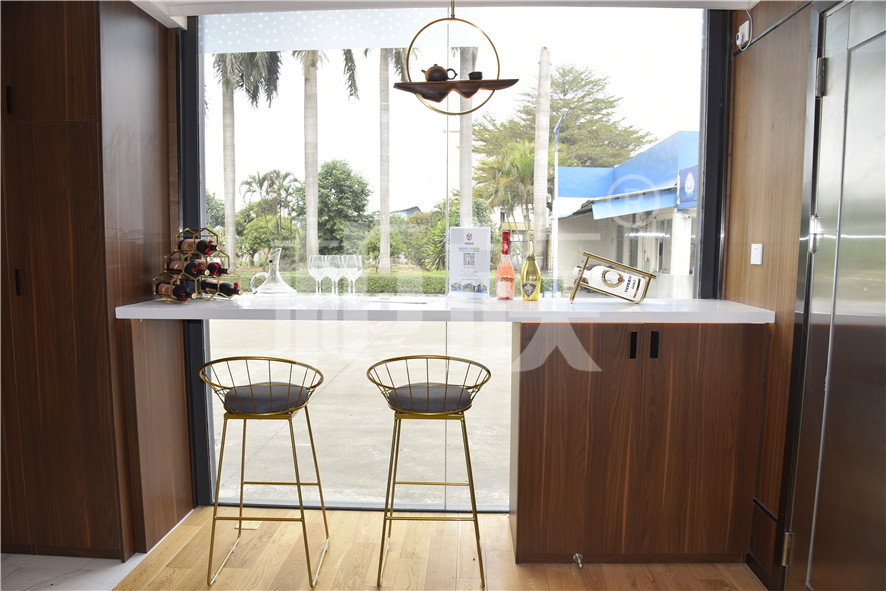 功能布局:入戶臺階,箱子整體抬高,前廳設吧臺和茶幾,樓面為隱藏式升降床,中部為衣柜、洗手臺及衛(wèi)生間,臥室內帶飄窗陽臺,配影音系統(tǒng)。大面積落地玻璃窗,適合觀景。設計用途為景區(qū)特色民宿。